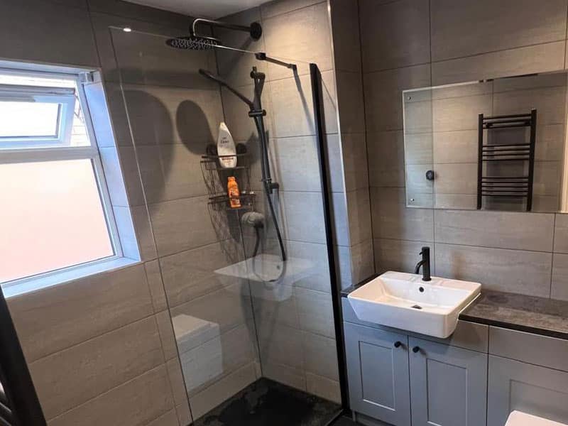 This dark, moody vibe is everything we hoped for, featuring sleek 1200 x 600 tiles that set the tone perfectly. The black tiles, mixer shower, bcabinet, and granite worktop give it a bold, modern feel, while the bronze tap and flush plate adds a unique, warm touch!