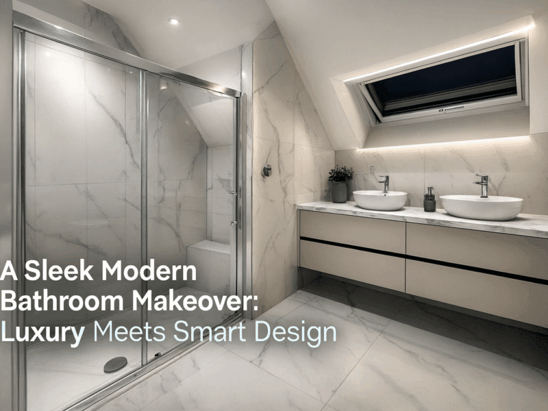 Check out this sleek, modern bathroom we’ve just completed. Featuring elegant marble-effect tiles, twin sit-on sinks, a floating vanity for a clean minimalist look, and a smar