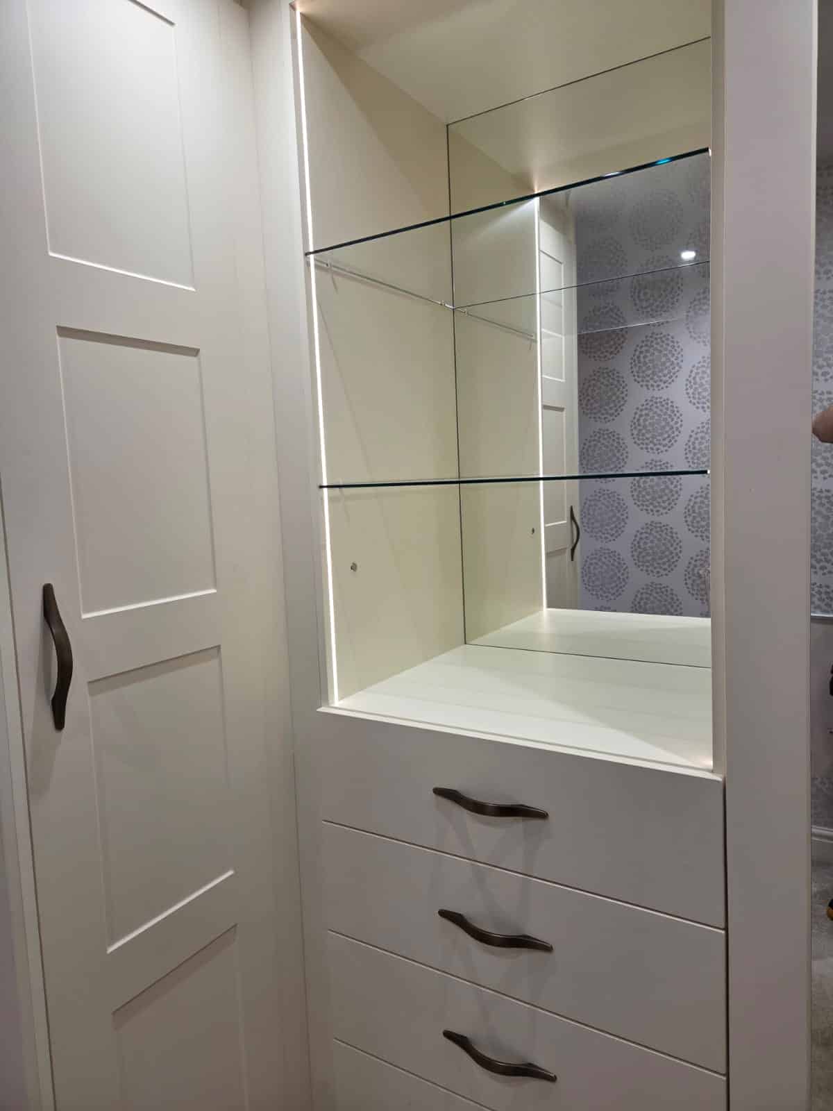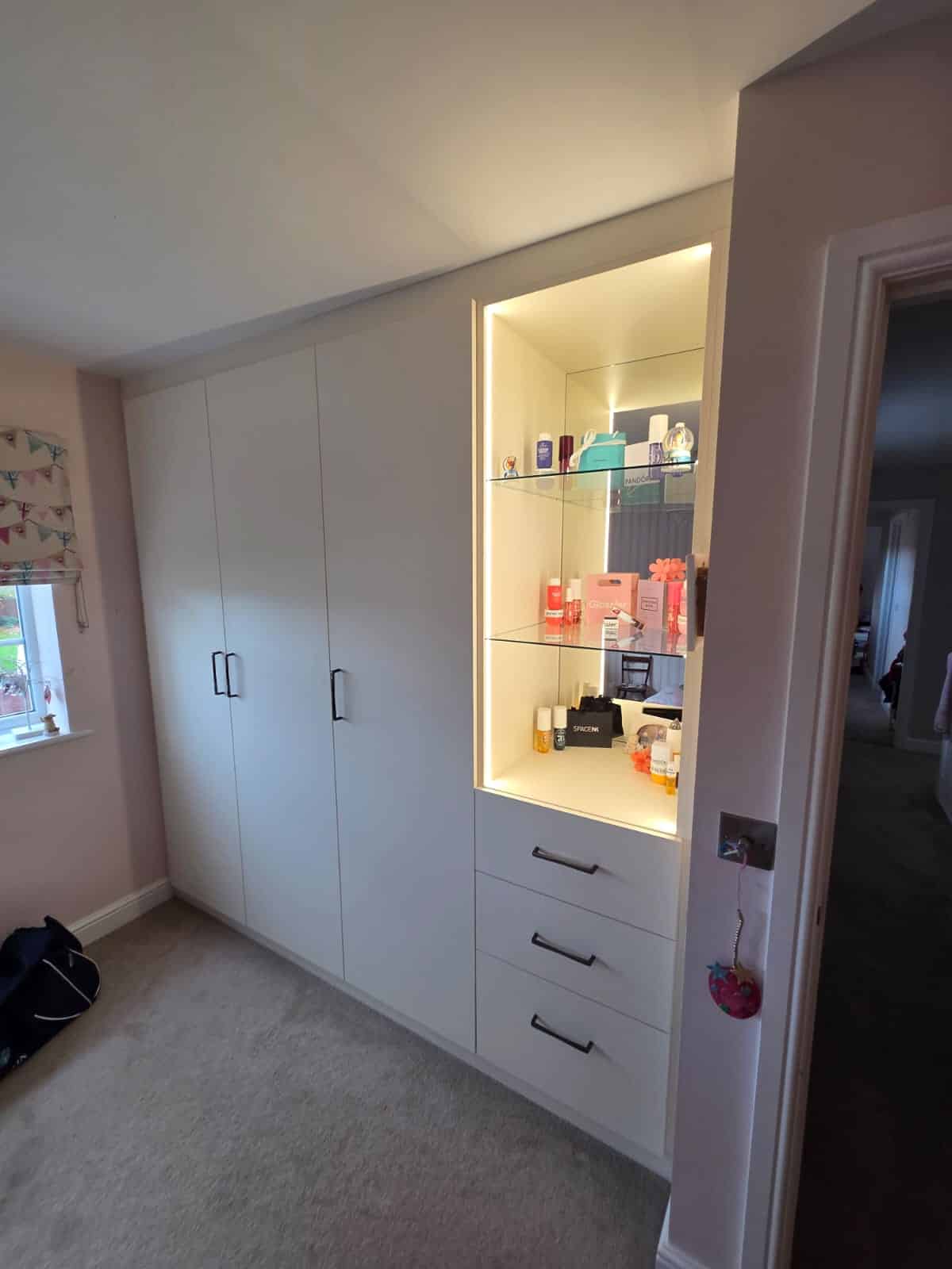 One of the standout features of these wardrobes is the open shelving area. This thoughtfully designed section allows the client to display their favourite skincare, fragrances and personal décor items—adding a warm, personalised touch to the space. To enhance this even further, we added integrated LED lighting, which brings a soft, ambient glow and elevates the whole look. The lighting highlights the display shelves beautifully, giving the room a high-end boutique feel without overwhelming the design.