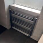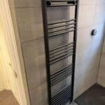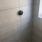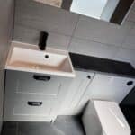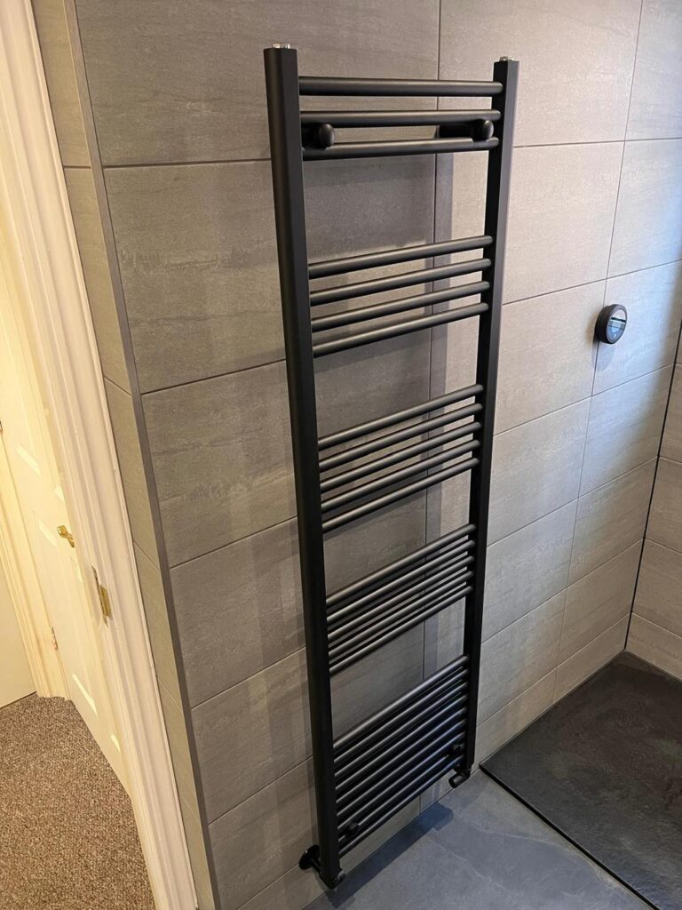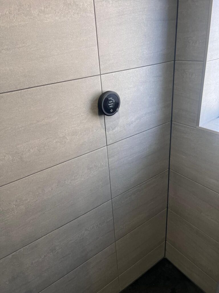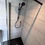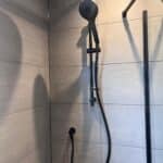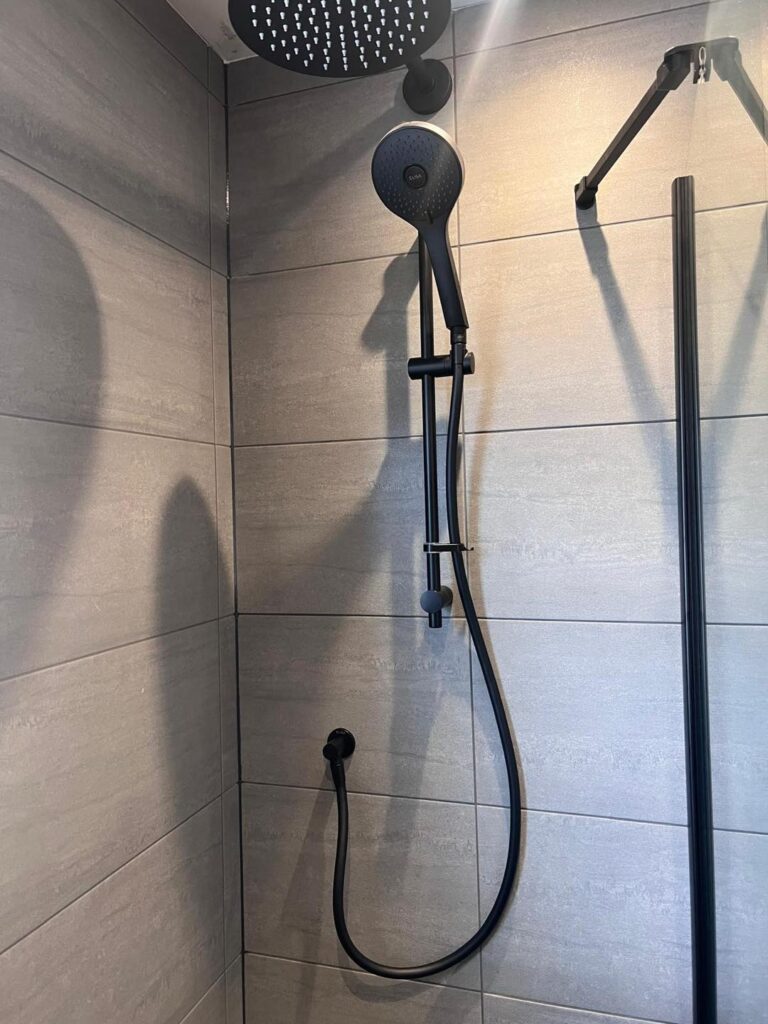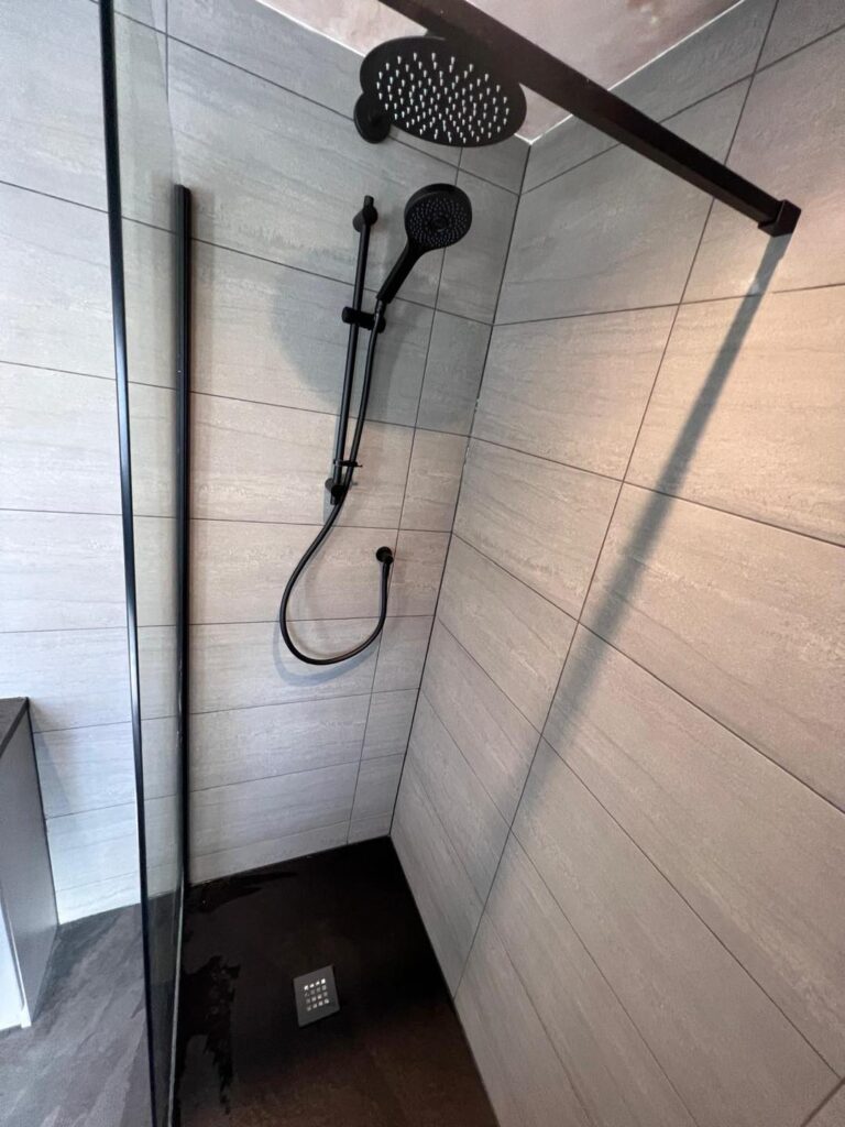 Both spaces are designed with sleek grey tiles and bold black fixtures including Digital Elisa showers, creating a modern, chic vibe.