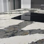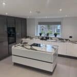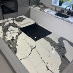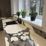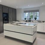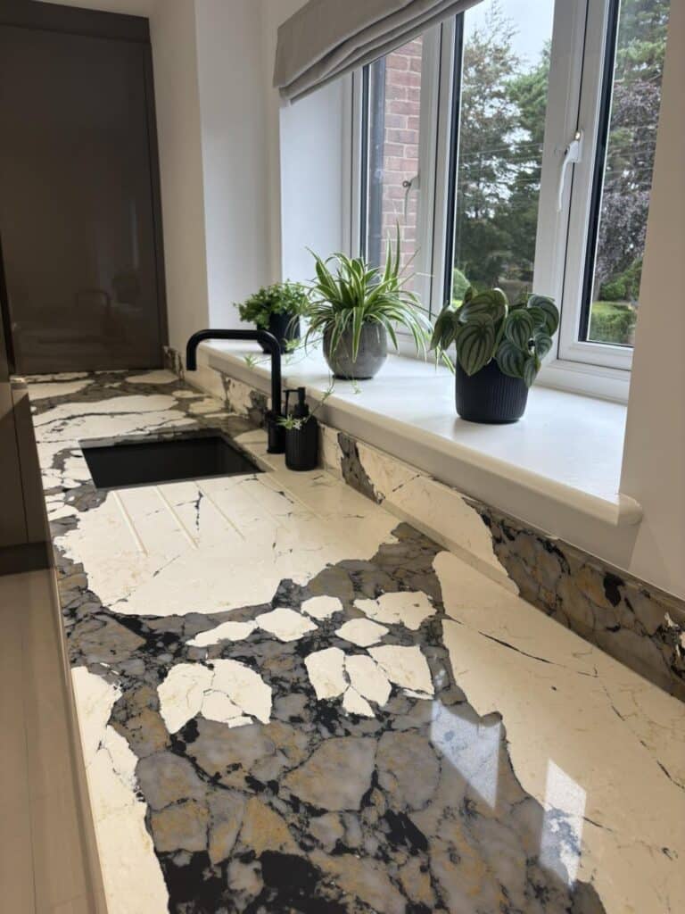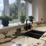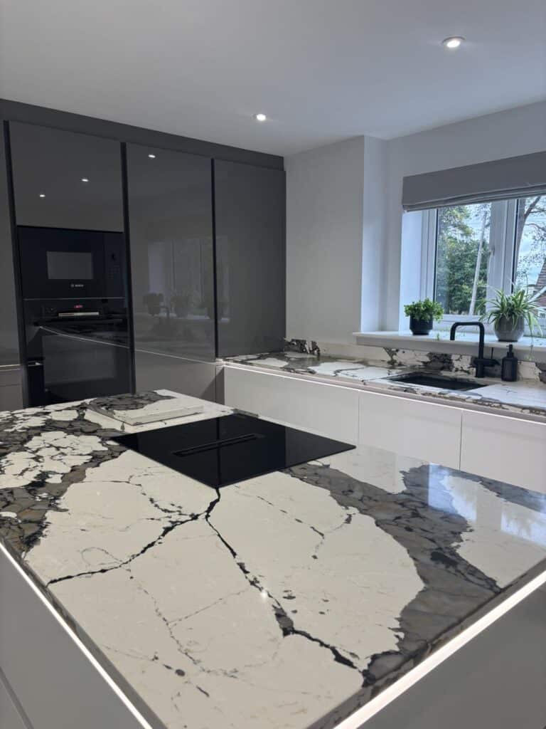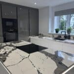 12 Sep Stunning kitchen featuring bold and unique Macchia Vecchia quartz worktops