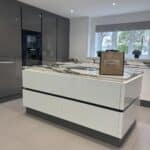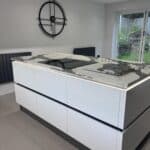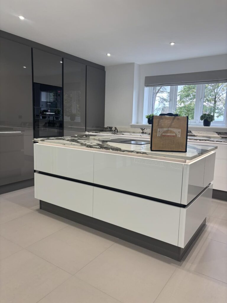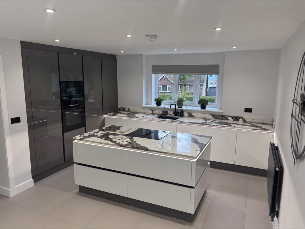 We paired it with our acrylic true handless doors, and the mirror-like reflection is next-level. The customers achieved a great bank of tall storage by locating the cooking area on the island, utilising a Bosch venting hob.